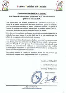 Les Forces Sociales de Guinée Invitent les autorités à éviter la politisation de la fête des femmes et en appellent à la responsabilité de tous et de toutes.