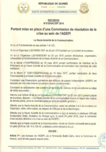 Avant d’aboutir au denouement heureux de la crise de ledaership qui mine l’AGEPI, Association Guinéenne des Editeurs de la Presse Indépendante, la commission de résolution de cette crise placée sous la direction de Monsieur Ousmane Camara OC (commissaire à la HAC) accompagné par les doyens Boubacar Yacine Diallo et Souleymane Diallo, entendra toutes les parties prenantes.