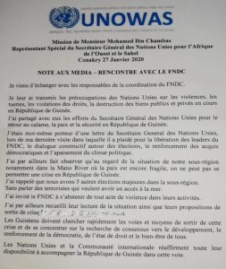 Le représentant spécial du secrétaire général des Nations Unies pour l’Afrique de l’Ouest et du Sahel a rencontré ce lundi 27 janvier 2020 à Conakry, des leaders du front national pour la défense de la constitution.