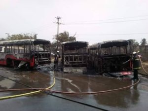 L’incendie s’est déclaré dans la journée de ce mercredi 15 avril 2020 au Parc de bus de transport public de la société Albayrak, sis à Matoto.
