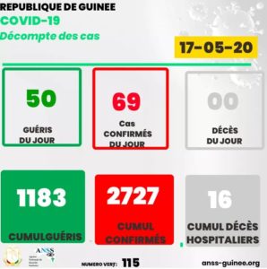 Au total, 2727 cas ont été confirmés du covid-19 dans le pays pour un cumul de guéris de 1183 et 16 décès hospitaliers. Ceci est la derrière statistique du tableau de l’Agence Nationale de la Sécurité Sanitaire publiée en fin du week-end.