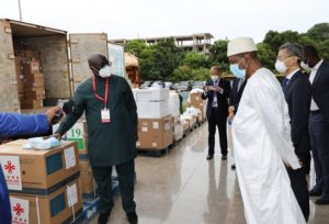 Communiqué : Sékhoutouréya, 19 juin 2020 – Le Palais Sékhoutouréya a servi de cadre ce jour à la remise d’un important lot d’équipements sanitaires offert par la République Populaire de Chine à la Guinée. C’est un geste qui se situe dans le cadre de la riposte contre la Covid-19. Le don est composé de 10.000 pièces de combinaison de protection médicale, 350.000 pièces de masque chirurgical, 15.000 paires de lunette de protection, 15.000 paires de gants d’examen médical jetables, 3.000 paires de chaussures jetables, 20.200 paires de masque N95 et 10.000 kits de test.