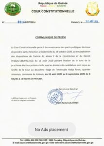 Selon l’institution dirigée par Mohamed Lamine Bangoura, les dossiers de candidature seront reçus au greffe de la Cour du 19 août au 8 septembre conformément aux dispositions de l’article 42 alinéa 2 de la constitution et du décret D/2020/188/PRG/SGG du 11 Août 2020 portant fixation de la date de la prochaine élection présidentielle.