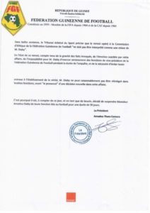 « Compte tenu de la gravité des faits invoqués, et l’émotion suscitée par cette affaire, de l’impossibilité pour M. Diaby d’exercer sereinement des fonctions de vice-président de la FEGUIFOOT pendant la durée de l’enquête et de la nécessité d’éviter toute entrave à l’établissement de la vérité, il ne peut raisonnablement pas être réintégré dans les dites fonctions, avant le prononcé d’une décision nouvelle dans cette affaire. C’est pourquoi à compter de ce jour, M. Diaby est suspendu de toutes ses fonctions liées au football pour une durée de 90 jours », a laissé entendre Amadou Tham Camara, président de la commission d’Ethique de la FEGUIFOOT.