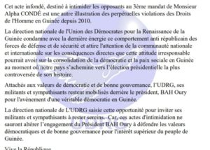 C’est avec la dernière énergie que la direction nationale du parti UDRG condamne fermement ce qu’elle qualifie de comportement anti-républicain des forces de défense et de sécurité. Elle dénonce à travers une déclaration adressée à la presse, une tentative d’intimidation des opposants au 3ème mandat du président Alpha Condé.
