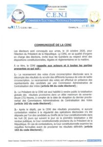 La CENI prévient que seul son président est habilité à rendre publics les résultats globaux du scrutin du 18 octobre 2020 dans un délai maximum de 72 heures à compter de la date de réception du dernier procès verbal des commissions administratives de centralisation.