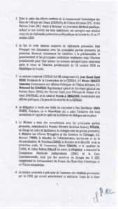 Pour rappel, le Général Francis A. BEHANZIN, Commissaire aux affaires politiques, à la paix et à la sécurité de la CEDEAO indique que ‘‘la mission a rencontré le chef de l’État, quelques membres du Gouvernement et le Premier ministre, la CENI, la Cour Constitutionnelle et l’opposant Cellou Dalein Diallo ’’.