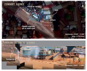 Une vidéo filmée à Kobayah (Conakry) le 21 octobre et authentifiée par Amnesty International montre un membre des forces de défense et de sécurité casqué et vêtu d’un gilet pare-balles tirer à trois reprises et à hauteur de personne en direction de présumés civils, sans aucune menace apparente sur sa vie ou celle d’une autre personne, en violation des règles internationales sur l’usage des armes à feu par les forces armées.