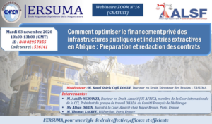 L’Ecole Régionale Supérieure de la Magistrature (ERSUMA) de l’Organisation pour l’Harmonisation en Afrique du Droit des Affaires (OHADA), en partenariat avec la Facilité Africaine de Soutien Juridique (ALSF), organise le mardi 03 novembre 2020 sa 16ème matinée de formation (gratuit) par visioconférence Zoom, sur le thème : « Comment optimiser le financement privé des infrastructures publiques et industries extractives en Afrique : Préparation et rédactions des contrats ».