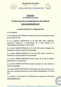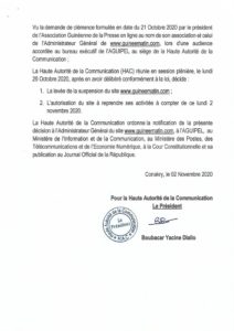 Ci-dessous, la décision de la Haute Autorité de la communication autorisant la reprise des activités site Guineematin.