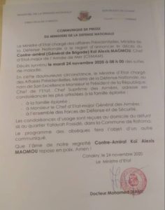 Le Contre-amiral (Général de Brigade) Alexis Akoi Maomou, chef d’état-major de l’Armée de Mer a tiré sa révérence, le mardi 24 novembre 2020, des suites de maladie.