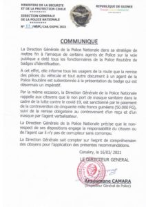 Dans un communiqué, la Direction générale de la police nationale invite les usagers de la route au respect du port de masque contre le covid-19 pour éviter toute sanction pécuniaire relative au pépiement de 50.000 GNF .
