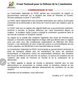 Le Front National pour la Défense de la Constitution du 07 mai 2010, apprécie à sa juste valeur le rapport accablant du département d’État américain sur la situation des droits de l’Homme en Guinée.