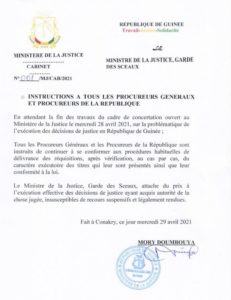 Dans un communiqué diffusé au JT de la RTG, le ministre de la justice Me Mory Doumbouya a invité les cours et tribunaux, les avocats et les huissiers de justice et toutes les autres parties concernées à la reprise de leurs activités dès ce jeudi 29 avril 2021.