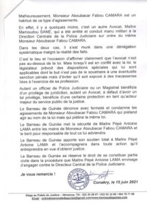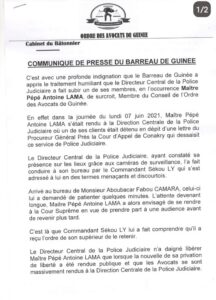 Dans un communiqué de presse rendu public ce mardi 15 juin, l’ordre des avocats de Guinée a condamné les agissements du directeur central de la police judiciaire Aboubacar Fabou Camara contre un de ses membres maître Antoine Pepe Lama.