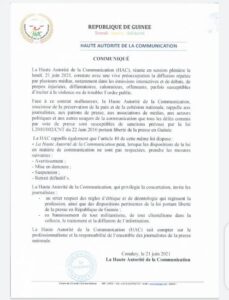 Dans un communiqué en date du 21 juin 2021, la Haute Autorité de la Communication a mis en garde les médias guinéens en ce qui ce concerne la diffusion des propos injurieux, diffamatoires qui pourraient inciter à la violence, dans le pays.