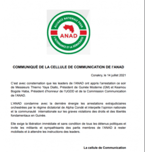 Ils sont deux opposants de l’Alliance Nationale pour l’Alternance et la Démocratie (ANAD) qui ont été arrêtés dans l’après-midi du mercredi, 14 juillet 2021, à Lambandji, dans la commune de Ratoma.Il s’agit de Kéamou Bogola Haba (président d’honneur du parti UGDD) et Thierno Yaya Diallo (président du parti Guinée moderne).