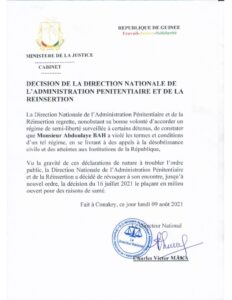 Dans un communiqué publié ce lundi 09 août 2021, la Direction Nationale de l’Administration Pénitentiaire et de la Réinsertion a donné les raisons de la révocation du régime de semi-liberté surveillée accordé à Abdoulaye Bah.