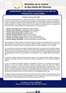 Dans un communiqué publié ce mercredi 16 novembre 2022 , le ministre de la justice et des Droits de l’Homme a enjoint le procureur général près la cour d’appel de Conakry d’engager ou de faire engager des poursuites contre Yaya Sow, Patrice Toupou secrétaire général, Cheick Ahmed Tidiane Camara, chef de cabinet, Demba Kourouma, conseiller principal, Rodrigue Georges Loua, conseiller juridique, Aly Condé, Directeur général du Fonds d’Entretien Routier (FER) et Sâa Yolande Camara, Directeur national de l’entretien routier.