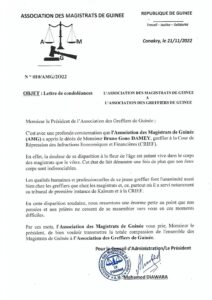 Suite au décès de Bruno Gono Damey. Greffier à la Cour de répression des infractions économiques et financières (CRIEF), l’Association des Magistrats de Guinée (AMG), à travers son président du Conseil d’administration (CA) Mohamed Diawara a présenté ses condoléances à l’Association des Greffiers de Guinée.