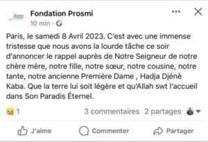 L’information vient de tomber, l’ancienne première dame de la république à tiré sa révérence à Paris en France. Hadja Djènè Kaba Condé est décédée à l’hôpital américain de Paris des suites de maladie.